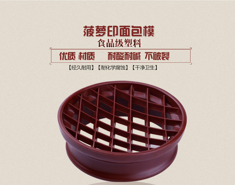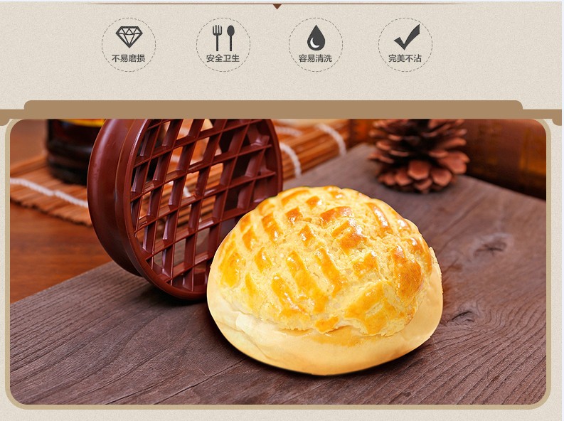 名称:菠萝包模具 材质:食品级塑料 尺寸:102*90*30CM 颜色:常规图片色,其他颜色可以定制